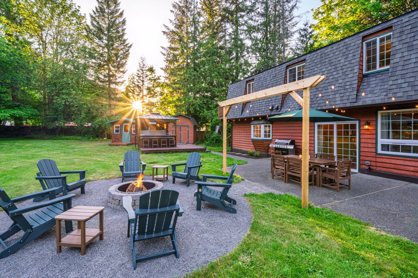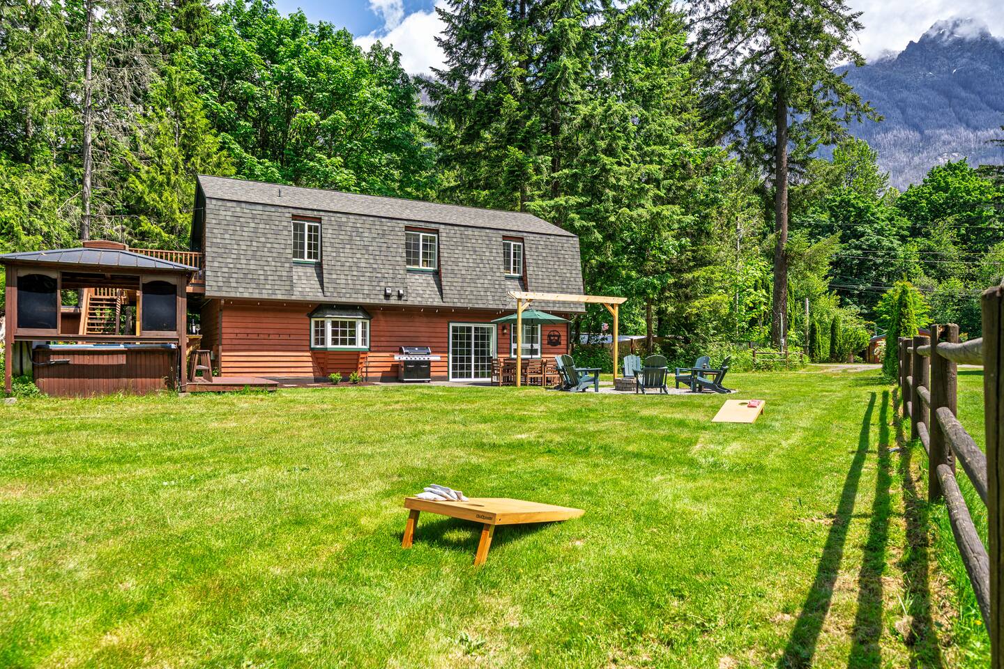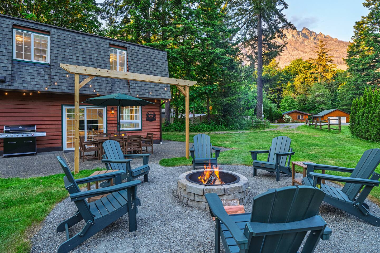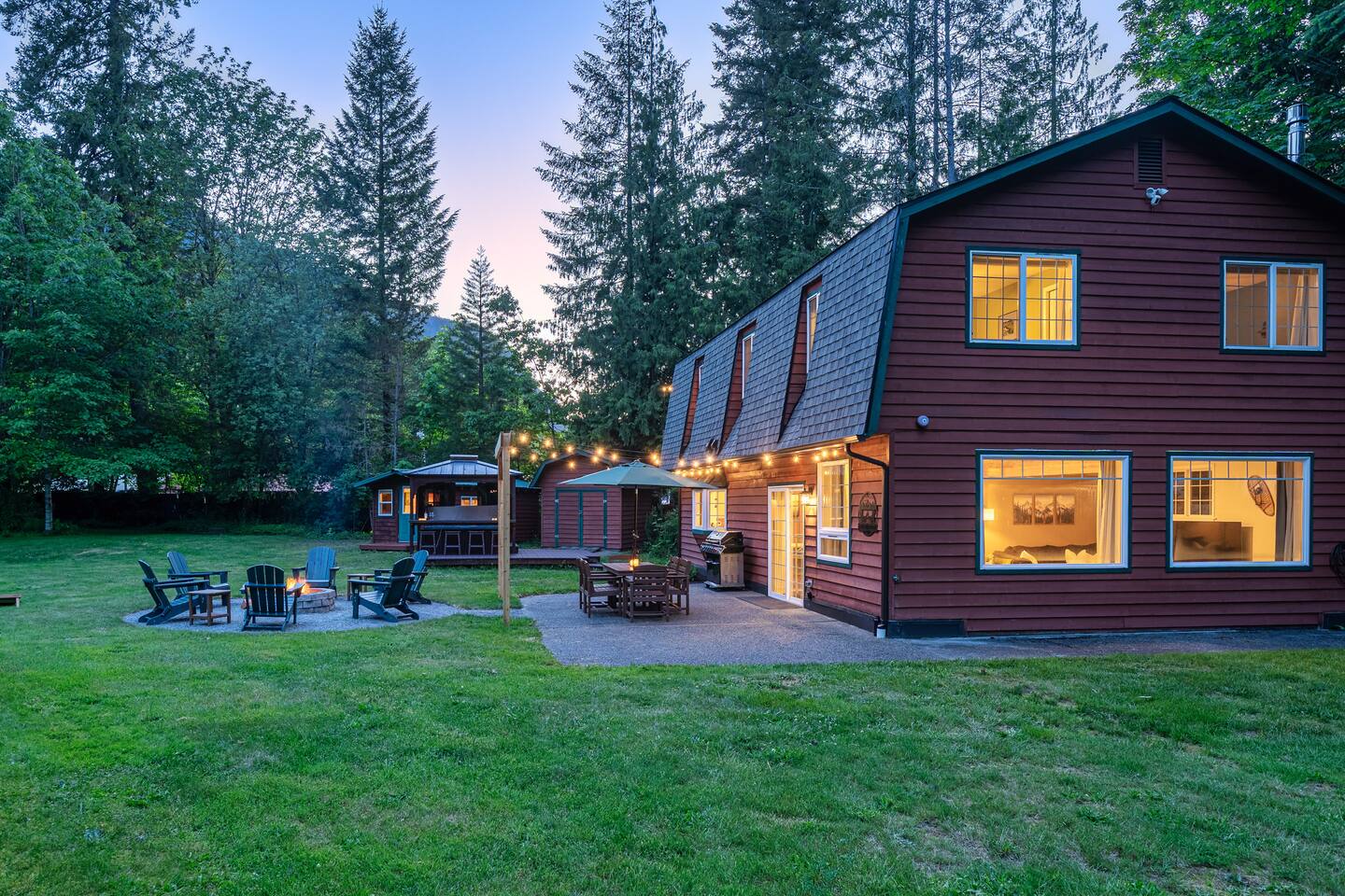 🏡 About this home Welcome to The Retreat at River’s Edge, a cozy Dutch Colonial cabin nestled in the Cascade foothills along the Skykomish River. Whether you're here for a family vacation, ski weekend, hiking adventure, or simply to unwind, this is your peaceful basecamp. Enjoy a spacious sun-filled yard with stunning mountain views, relax in the hot tub under the stars, or gather around the fire pit after a day on the trails. Just over an hour from Seattle and only 20 minutes from Stevens Pass, you're perfectly positioned for year-round adventure. 🛏️ The Space Our retreat offers plenty of room for groups or families: Main House: 4 bedrooms total: (5th bedroom in the detached bunkhouse!) 3 rooms with queen beds 1 room with a full-over-full bunk bed Fully equipped kitchen with bar seating Large living room with comfy futon that folds flat into a full bed for additional sleeping space Full bathroom downstairs + laundry area Cozy propane stove with automatic thermostat for chilly nights, and individual zoned heating for every area of the home. Mitsubishi AC mini-split downstairs, and plenty of fans for the upstairs. Bunkhouse: 1 separate 5th bedroom just steps from the main house Full-size futon bed, TV, desk and extra seating. Fan and heater included for all year long comfort! (No bathroom in bunkhouse though!) Extras include: Private covered hot tub with bar top seating Outdoor fire pit area (firewood available on request) Large yard with room to play, relax, or stargaze Easy access to the Skykomish River and nearby trailheads
