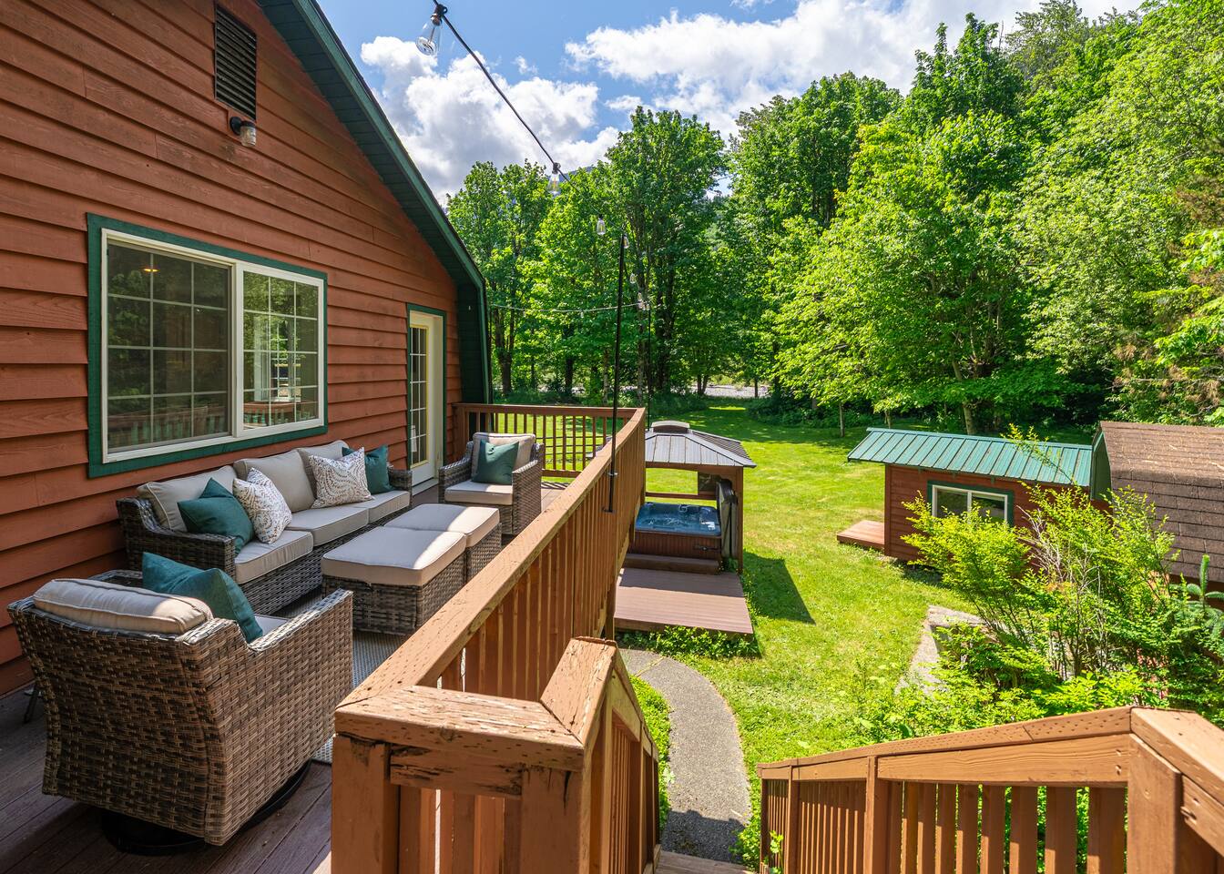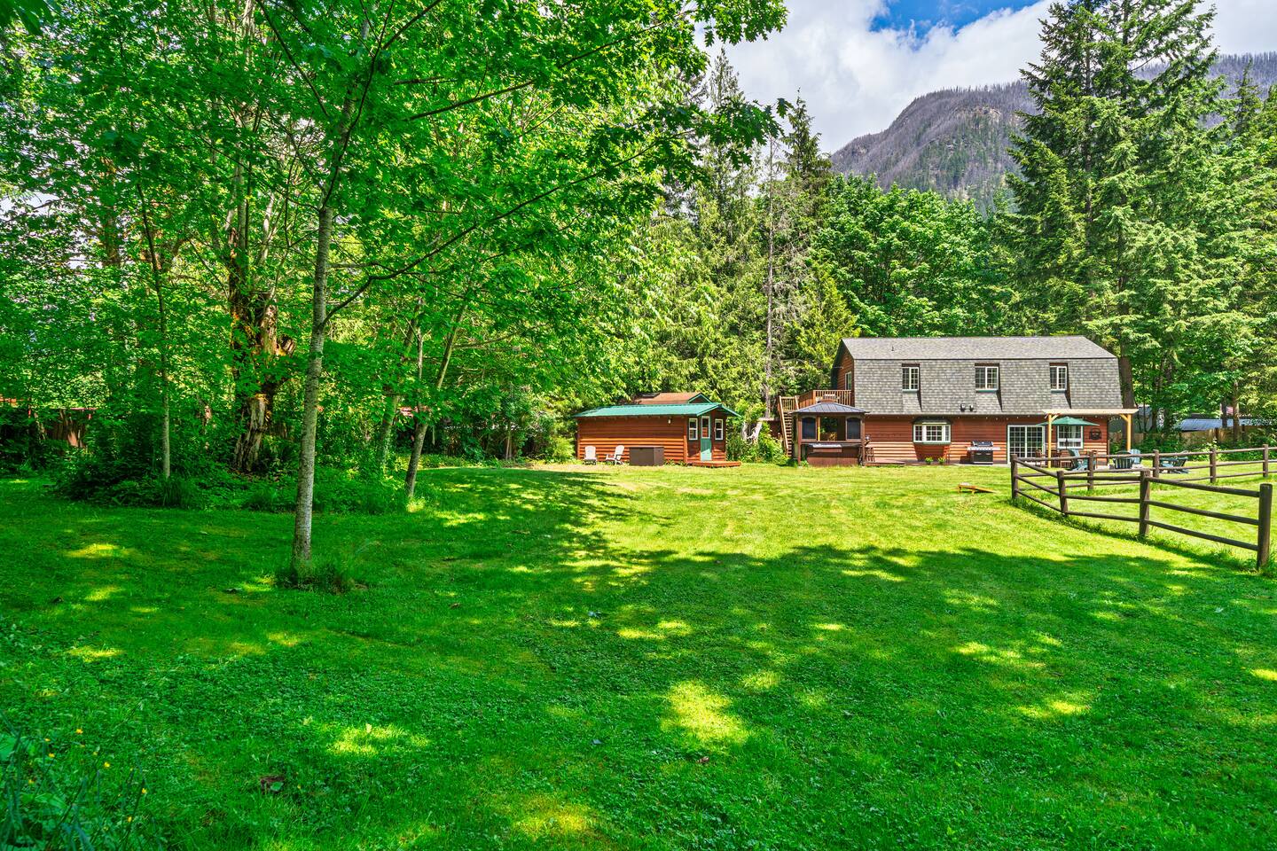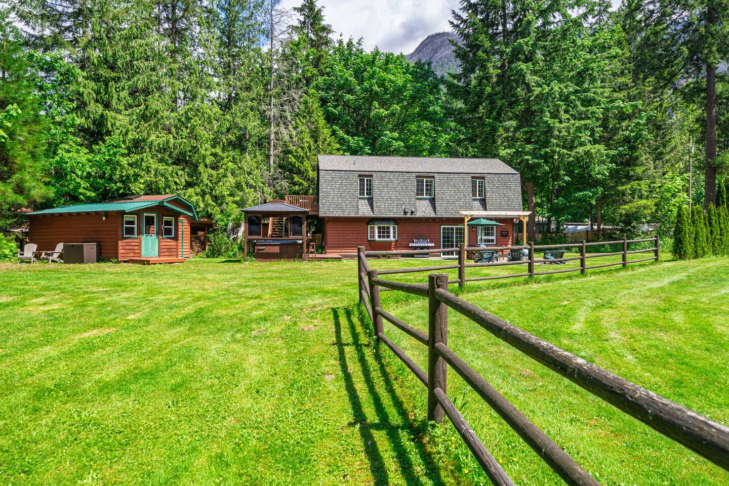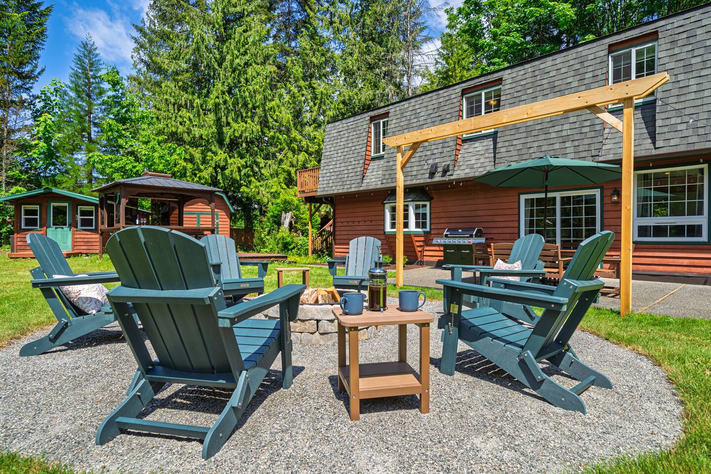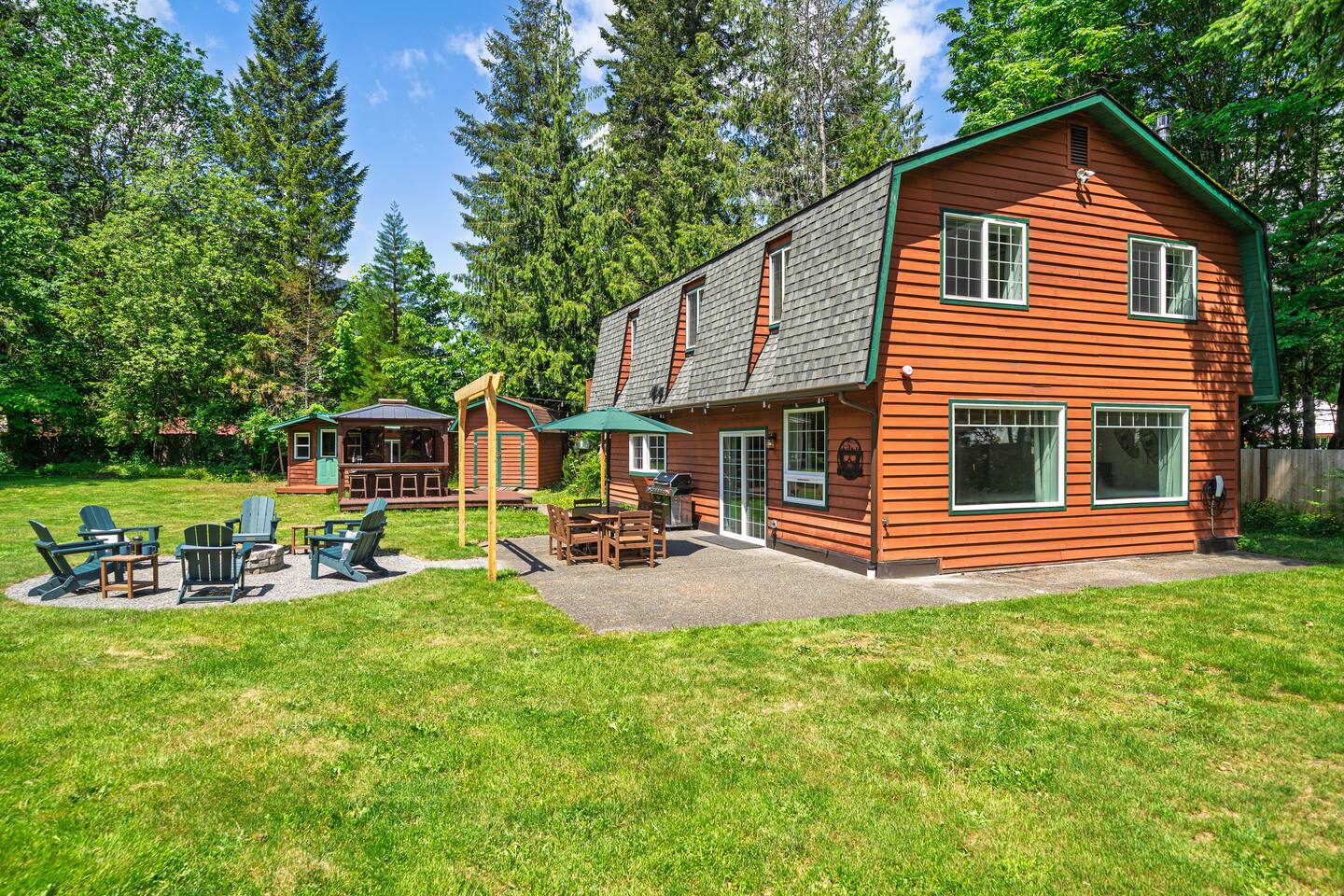 🏡 About this home Welcome to The Retreat at River’s Edge, a cozy Dutch Colonial cabin nestled in the Cascade foothills along the Skykomish River. Whether you're here for a family vacation, ski weekend, hiking adventure, or simply to unwind, this is your peaceful basecamp. Enjoy a spacious sun-filled yard with stunning mountain views, relax in the hot tub under the stars, or gather around the fire pit after a day on the trails. Just over an hour from Seattle and only 20 minutes from Stevens Pass, you're perfectly positioned for year-round adventure. 🛏️ The Space Our retreat offers plenty of room for groups or families: Main House: 4 bedrooms total: (5th bedroom in the detached bunkhouse!) 3 rooms with queen beds 1 room with a full-over-full bunk bed Fully equipped kitchen with bar seating Large living room with comfy futon that folds flat into a full bed for additional sleeping space Full bathroom downstairs + laundry area Cozy propane stove with automatic thermostat for chilly nights, and individual zoned heating for every area of the home. Mitsubishi AC mini-split downstairs, and plenty of fans for the upstairs. Bunkhouse: 1 separate 5th bedroom just steps from the main house Full-size futon bed, TV, desk and extra seating. Fan and heater included for all year long comfort! (No bathroom in bunkhouse though!) Extras include: Private covered hot tub with bar top seating Outdoor fire pit area (firewood available on request) Large yard with room to play, relax, or stargaze Easy access to the Skykomish River and nearby trailheads