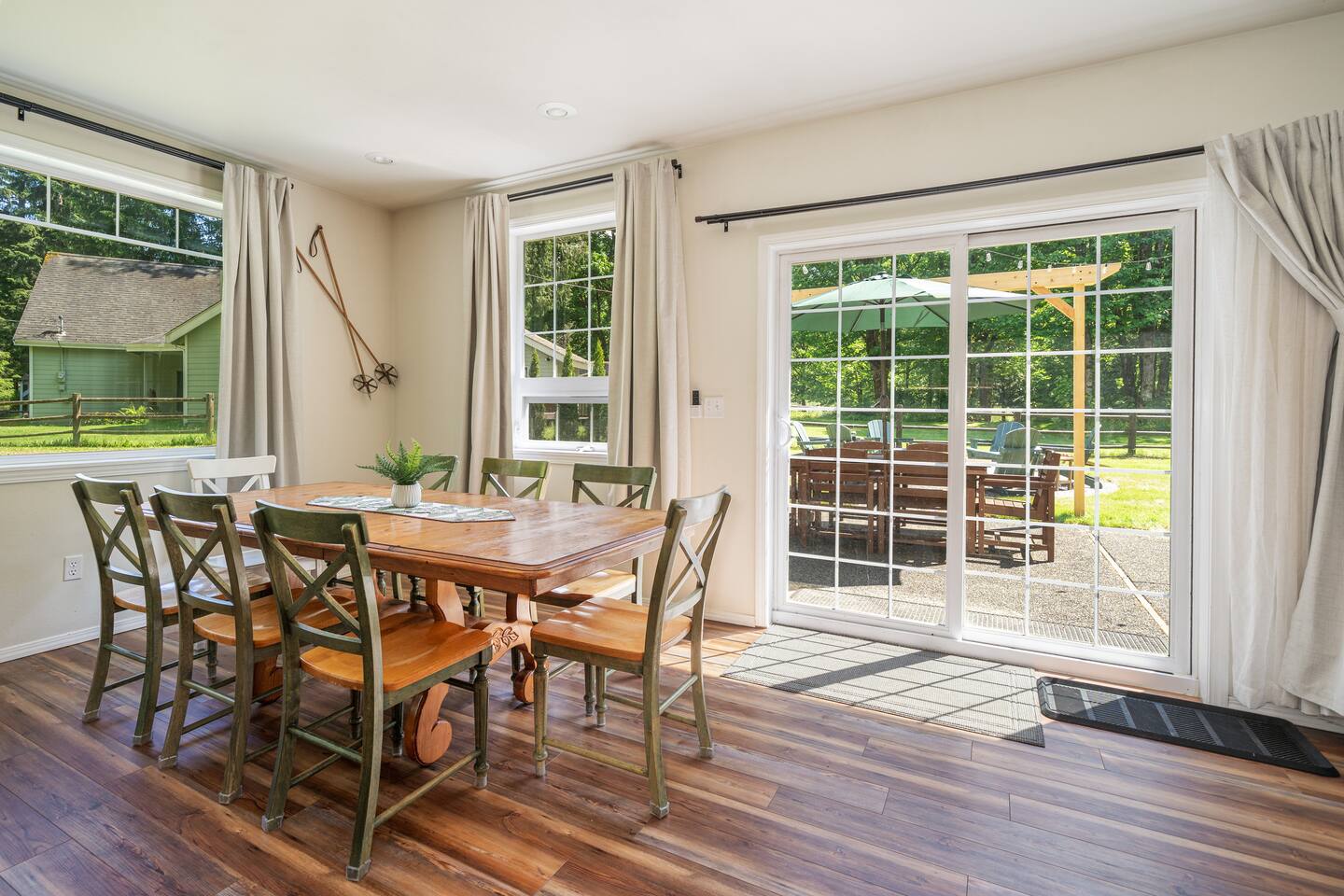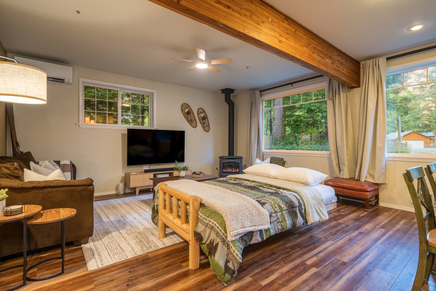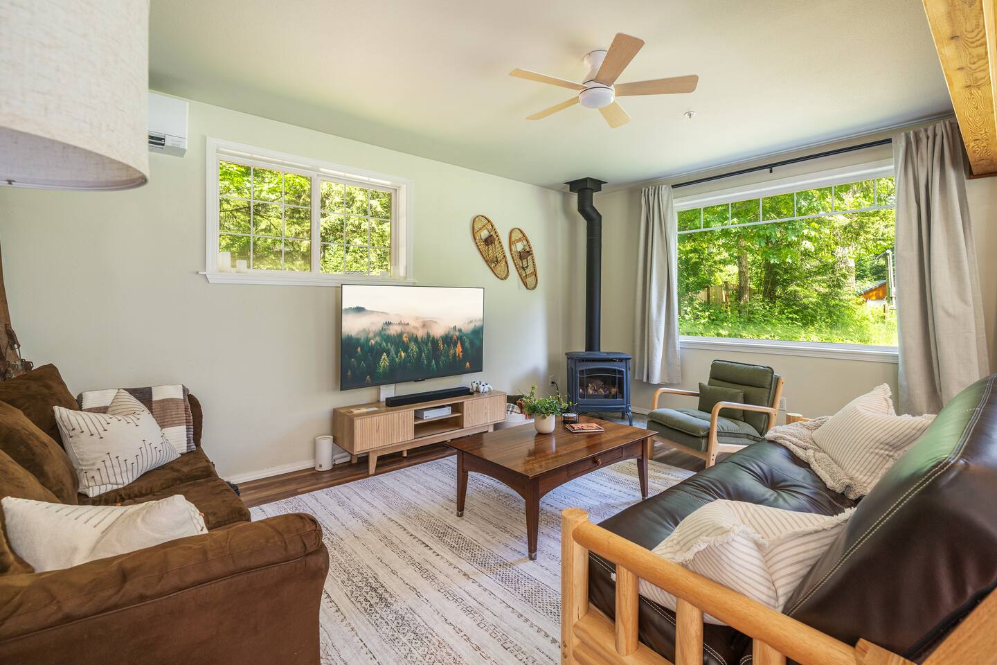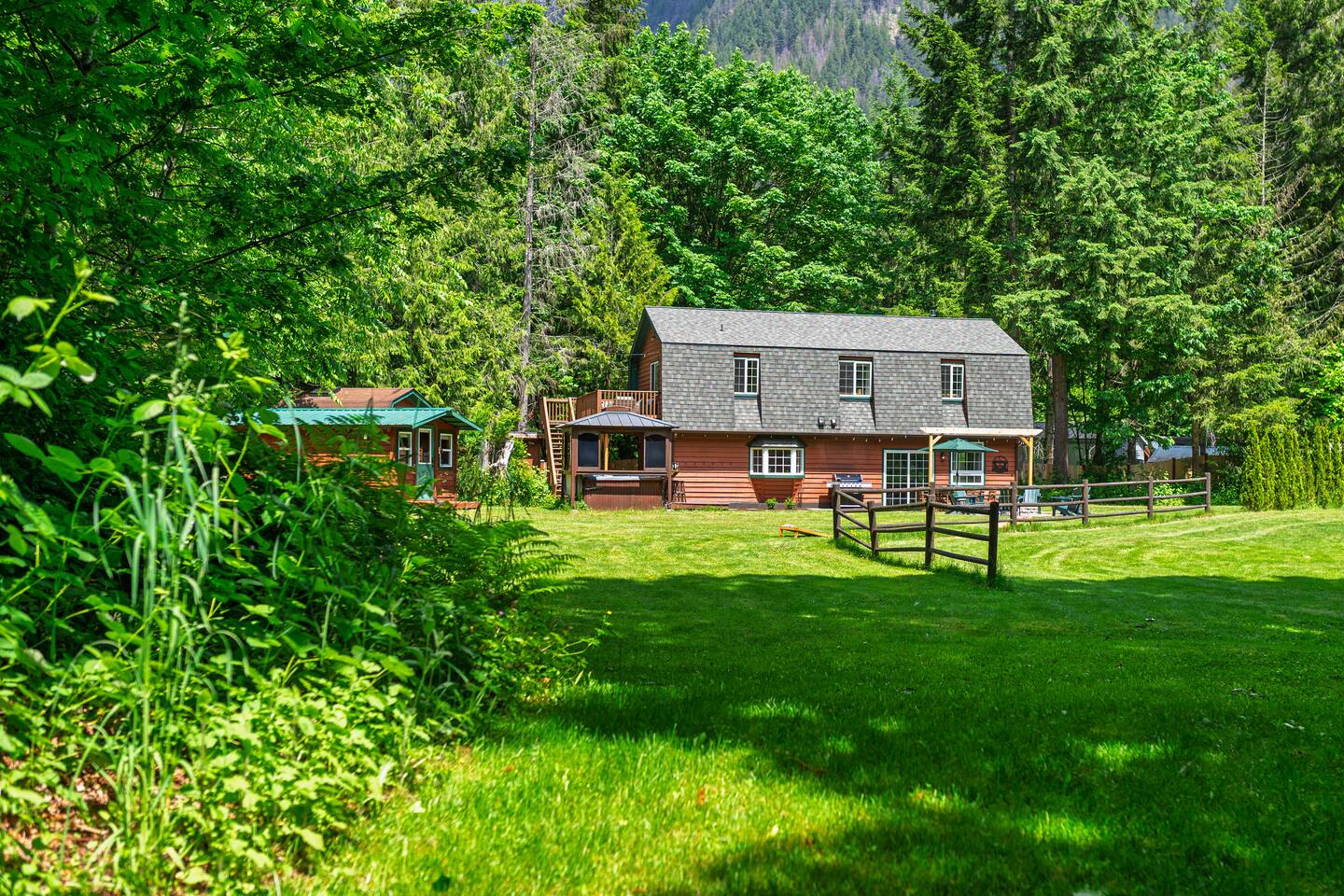 🏡 About this home Welcome to The Retreat at River’s Edge, a cozy Dutch Colonial cabin nestled in the Cascade foothills along the Skykomish River. Whether you're here for a family vacation, ski weekend, hiking adventure, or simply to unwind, this is your peaceful basecamp. Enjoy a spacious sun-filled yard with stunning mountain views, relax in the hot tub under the stars, or gather around the fire pit after a day on the trails. Just over an hour from Seattle and only 20 minutes from Stevens Pass, you're perfectly positioned for year-round adventure. 🛏️ The Space Our retreat offers plenty of room for groups or families: Main House: 4 bedrooms total: (5th bedroom in the detached bunkhouse!) 3 rooms with queen beds 1 room with a full-over-full bunk bed Fully equipped kitchen with bar seating Large living room with comfy futon that folds flat into a full bed for additional sleeping space Full bathroom downstairs + laundry area Cozy propane stove with automatic thermostat for chilly nights, and individual zoned heating for every area of the home. Mitsubishi AC mini-split downstairs, and plenty of fans for the upstairs. Bunkhouse: 1 separate 5th bedroom just steps from the main house Full-size futon bed, TV, desk and extra seating. Fan and heater included for all year long comfort! (No bathroom in bunkhouse though!) Extras include: Private covered hot tub with bar top seating Outdoor fire pit area (firewood available on request) Large yard with room to play, relax, or stargaze Easy access to the Skykomish River and nearby trailheads